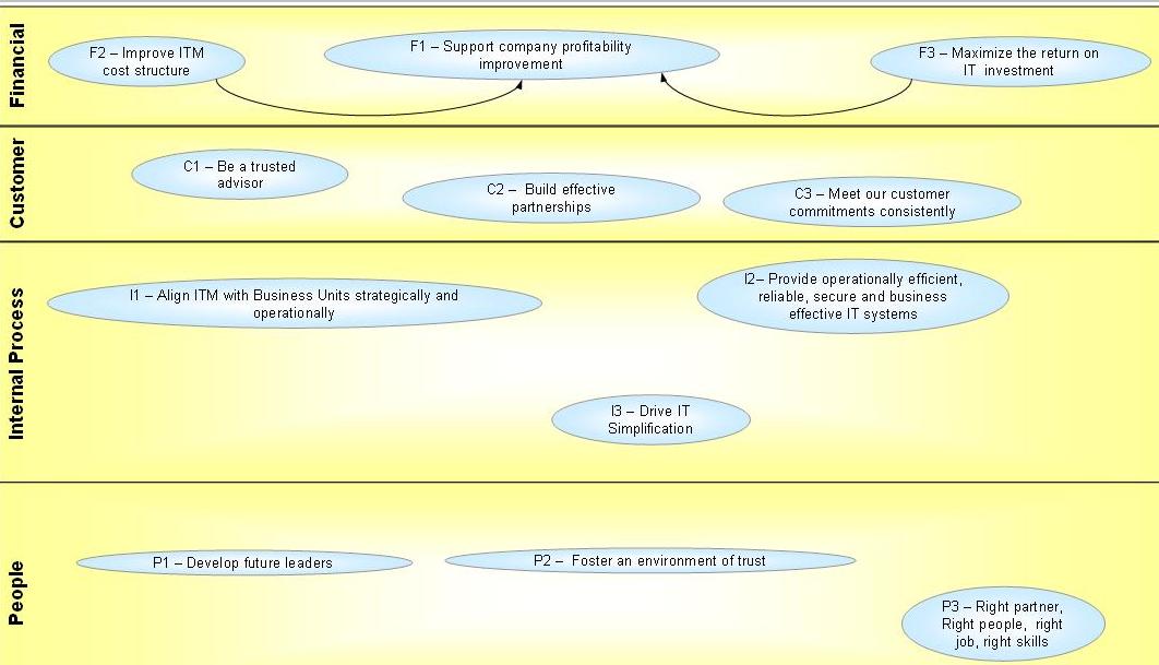 It can be formed by following any methodology. The concept is more important than the methodology. IT exist for a purpose. The purpose should be clearly understood by the IT organization. It is natural for the IT organization to be technical and lose sight of the business. That is an ignition for the IT failure eventually. For discussion purposes, I will take Kaplan and Norton strategy formation process. There are four perspectives in this framework. Learning & Growth (or people), Internal Process, Customers & finance. The concept is, there is should be dedicated focus in each perspective and if we have a right people & process, the company will have more customers, and if we they have more customer their finance will be have a positive impact. If their finance has a positive impact, then the profit organization will meet the share holders (or owners) expectation. Very simple and straight forward.