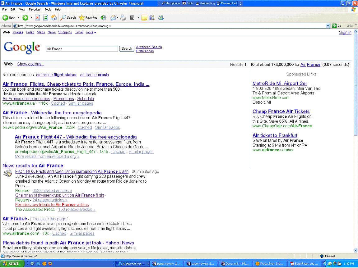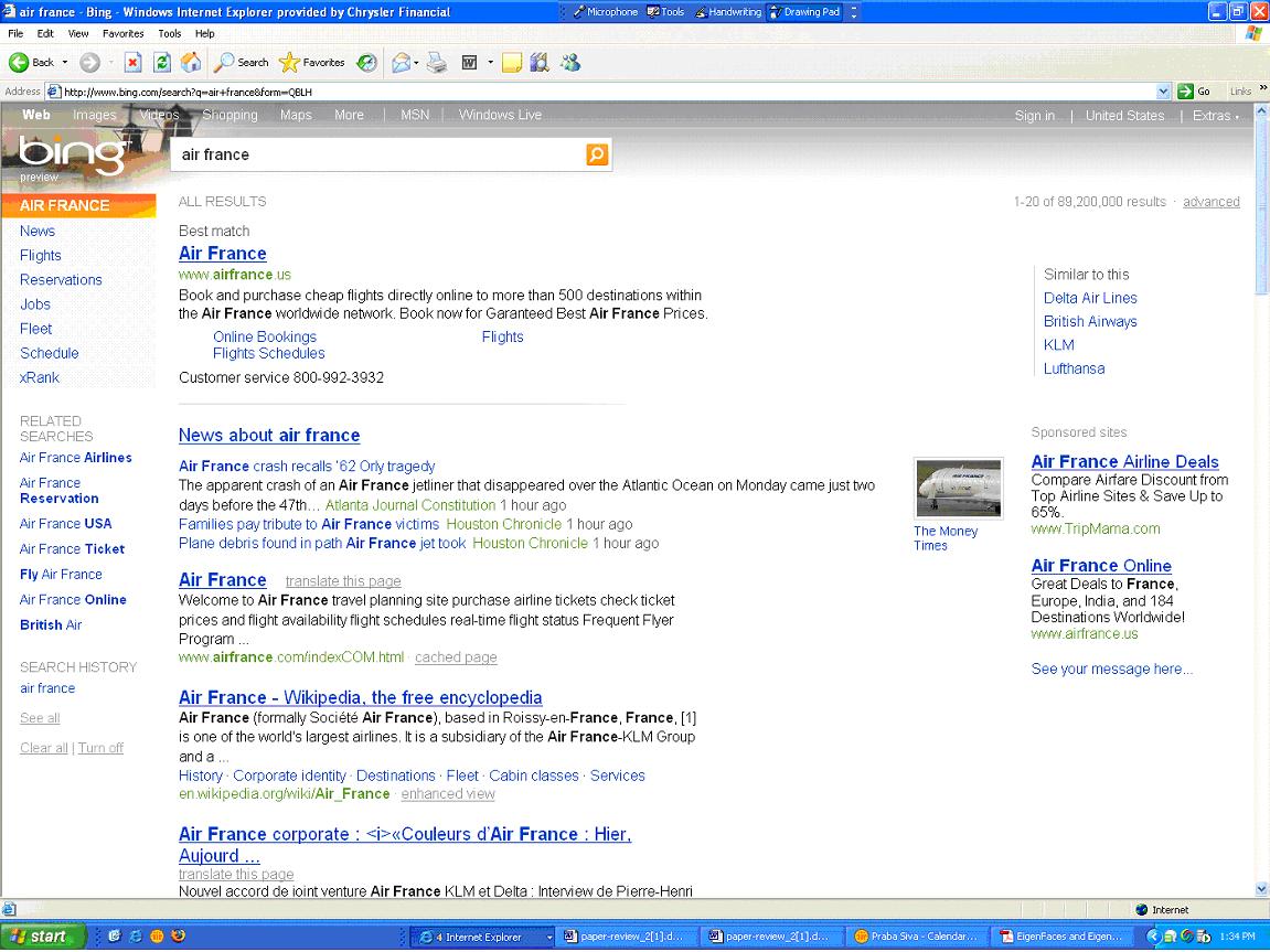 Google is an effective search engine today and Bing from Microsoft has recently been launched and before Bing’s launch, I had been waiting to study Bing search performance. On the day it was launched, I was playing around with Bing and searching for the key words like “Air France”. During the Bing launch week, there was an air tragic when Air France flight from Brazil was missing in the Atlantic. I was searching for “Air France” in the Bing and Google at the same time and you can see the bing search result and google search result. Even though both the search engine results were trying to sell Air France tickets, Google suggested if I’m looking for Air France Crash. Contextual search in Google is very powerful and at the same time it provides numerous results back for any popular key words. There are lots of room for improvement to narrow down the results to the users specific query.